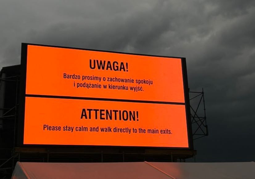 Treść przykrej dla festiwalowiczów wiadomości wyświetliła się także na telebimach przy scenie głównej. Wszystkiemu winna jest nagła zmiana pogody - wieczorem na terenie festiwalu zaczęło mocno wiać i padać, a na niebie pojawiły się błyskawice.