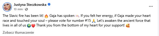 Słowiański ogień został zapalony! Gaja przemówiła. Jeśli poczułeś jej energię, jeśli Gaja sprawiła, że Twoje serce biło i poruszyło Twoją duszę – proszę o głos na numer #15 Obudźmy starożytną siłę, która żyje w każdym z nas Dziękuję z całego serca za Twoje wsparcie! - napisała Justyna Steczkowska w swoich social mediach.